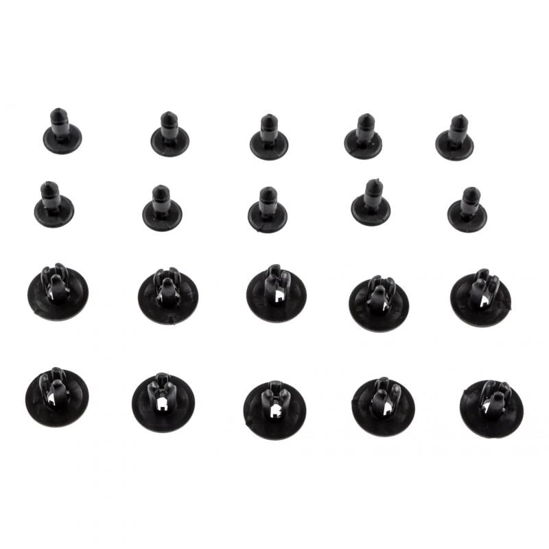 Dix clips de carrosserie de 15 mm de diamètre et de 11 mm de profondeur. Diamètre de la tige avant expansion : 6 mm.